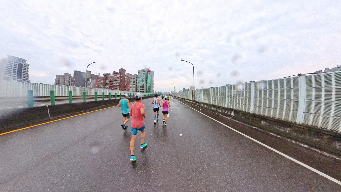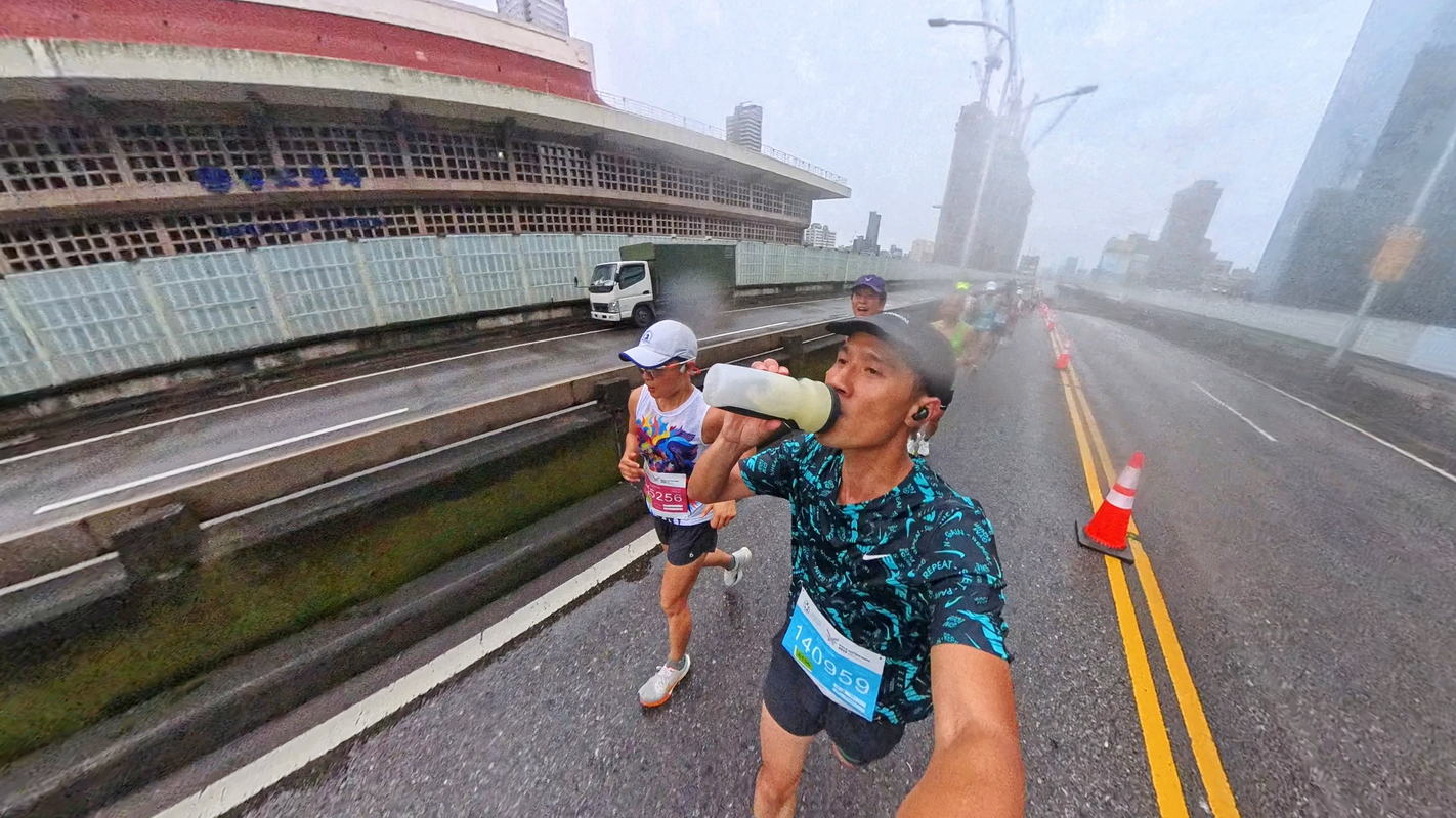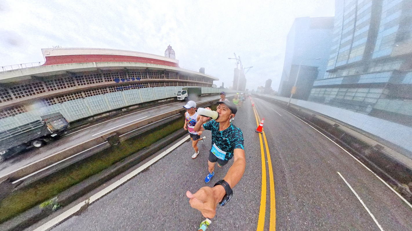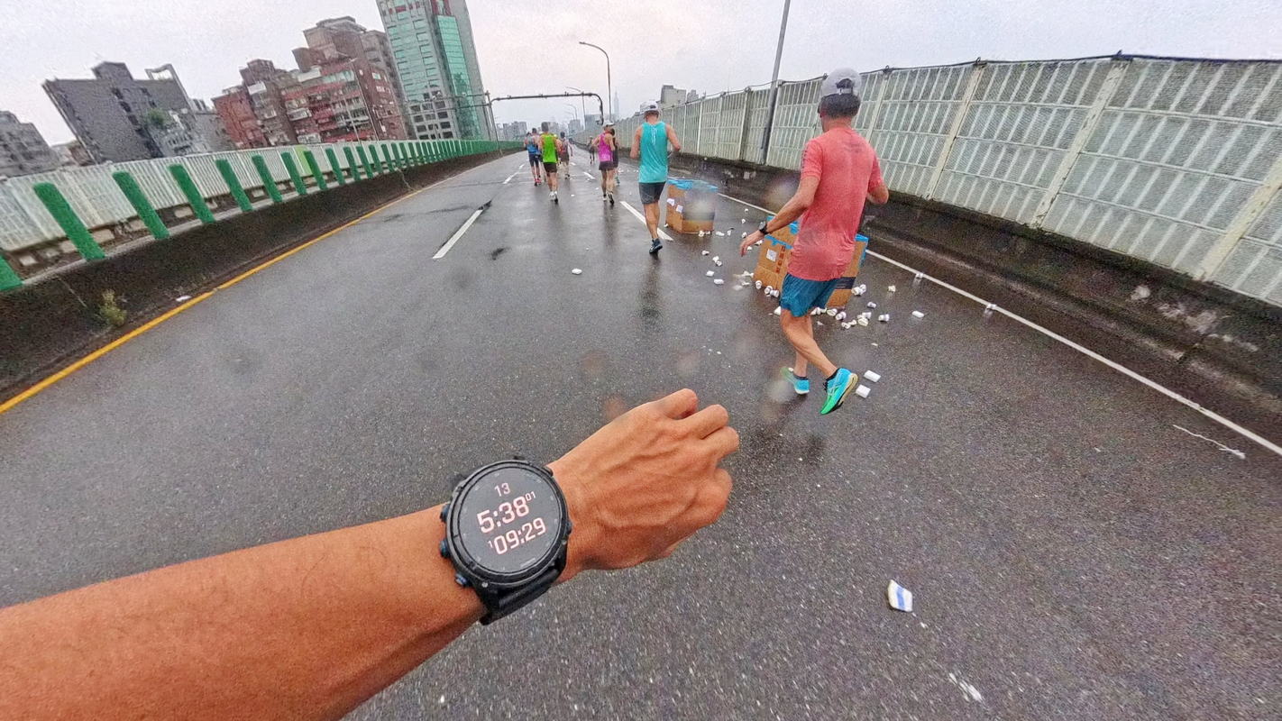 與大家一同從中華路轉進市民大道後,內心想著終於可以在大樓林立的市民大道高架路段上,透過雙腳享受台北路跑賽歷史中首次於市民大道舉行的慢跑風景了,殊不知,從12.5k位於機場捷運A1出口的匝道開始進入市民大道高架路段開始,一路前往位於18k處的折返點,這一段將近6k的路程中,不僅從有著15m的垂直爬升落差之外,同時在這段由西向東的路線中,更是一路緩上坡並伴隨著逆風的吹拂的天氣型態,因此我從原本欣賞風景的期待心情,隨著這段逆風上坡,逐漸消弭享受的期待感,取而代之的是,更為專注自己在上坡路段時,腳步、呼吸以及心率之間的節奏,同時因應體力已將消耗殆盡的後半賽段,避免被這6k的上坡拖垮而爆掉,改變策略,提早於15k進行第2次的果膠補給。