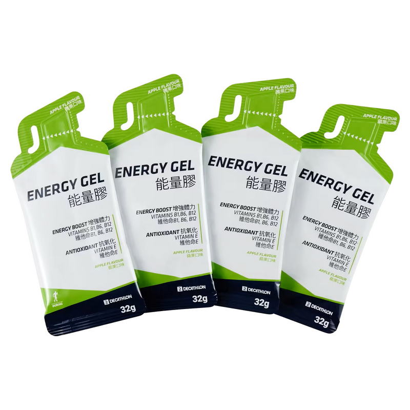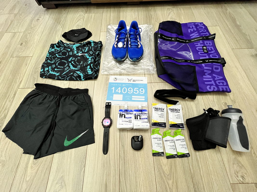 而在比賽前一天,因為習慣帶著自己的飲用補給,因此在這場21K的半馬賽事中,我準備了好入口的森永in果凍飲,1包為賽前30分鐘的開跑前補給,1包為賽後恢復補充,3包迪卡儂青蘋果口味的能量果膠,分別為比賽過程的50、80分鐘以及最後3k的補充,最後是迪卡儂檸檬口味的運動飲料粉1包兌500cc的水灌入運動水壺中,每2k喝一次,而在水壺腰帶中再放1包運動飲料粉,以備後續可能把運動飲料喝完需要在水站大量補充時使用。