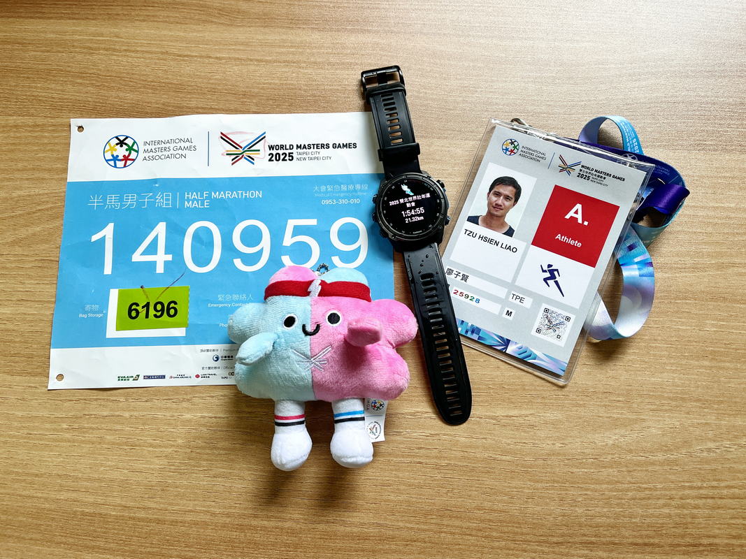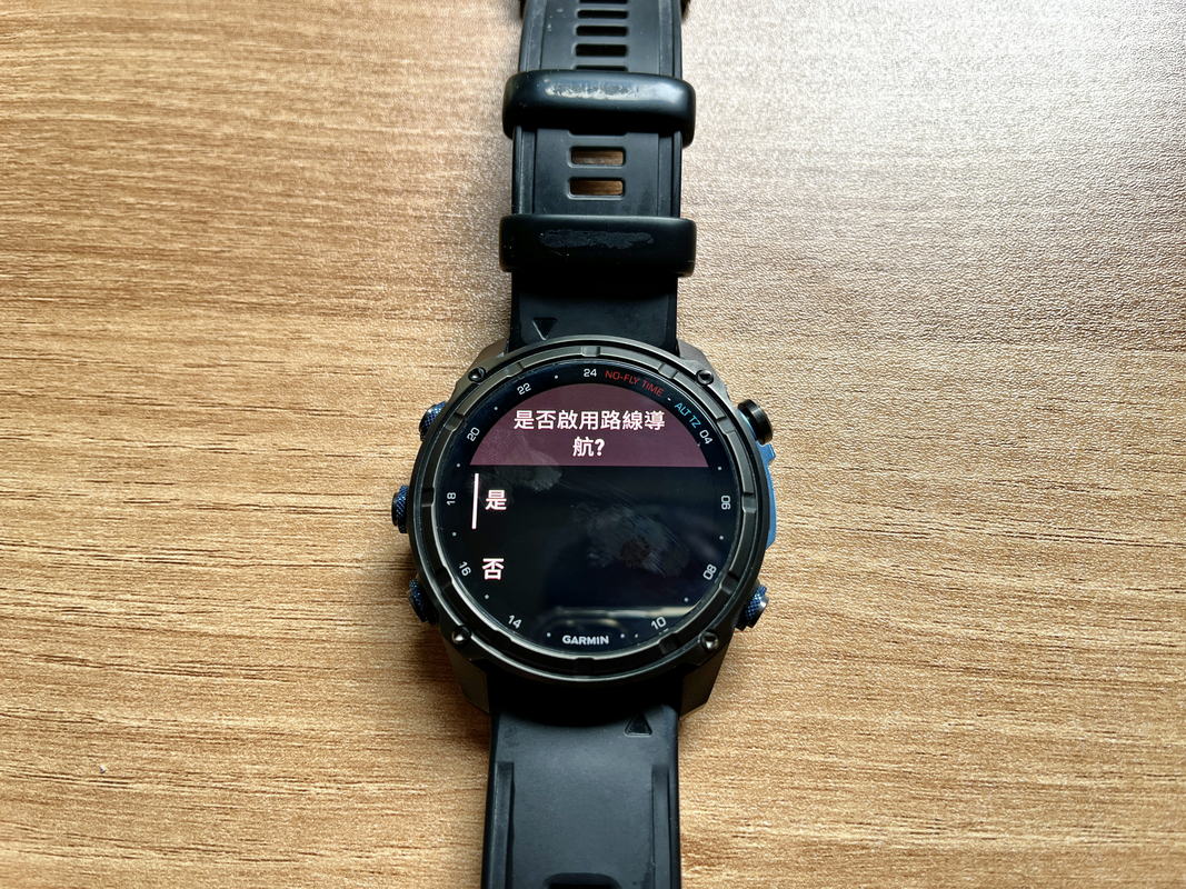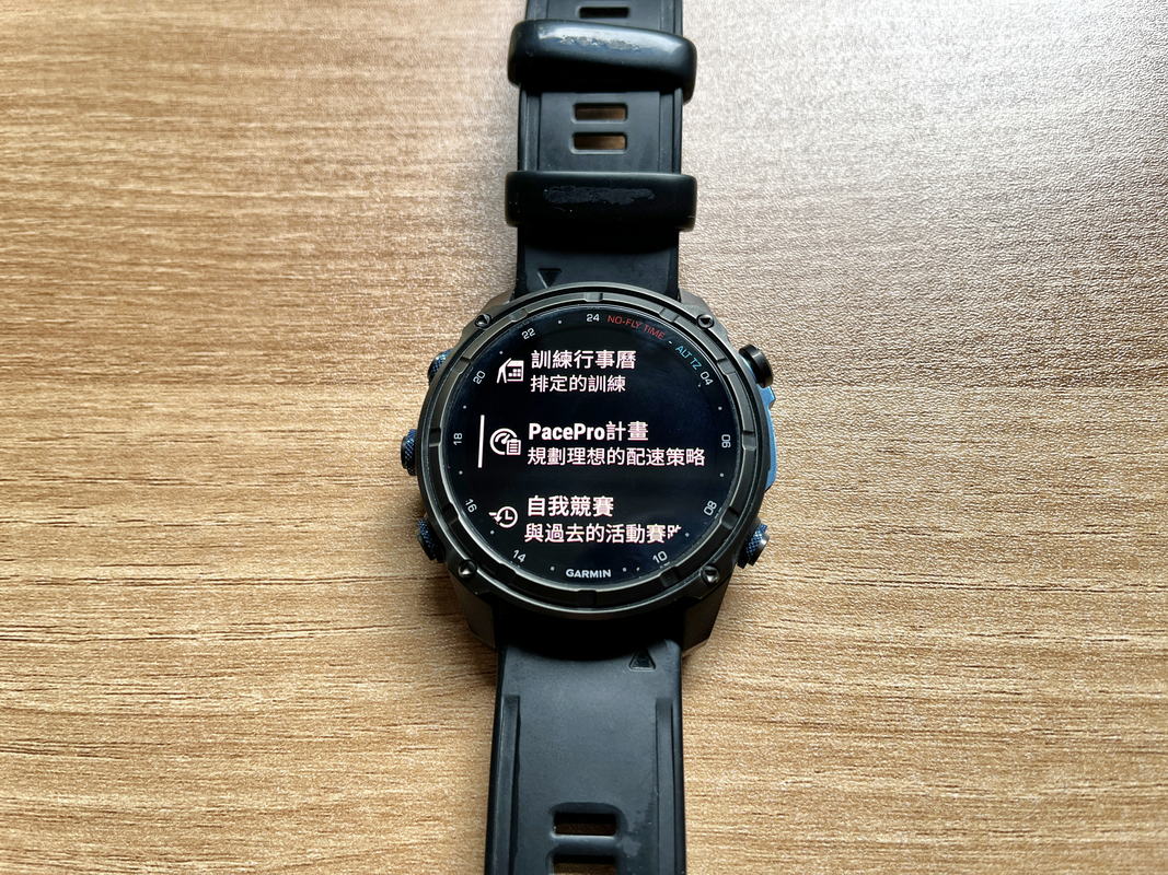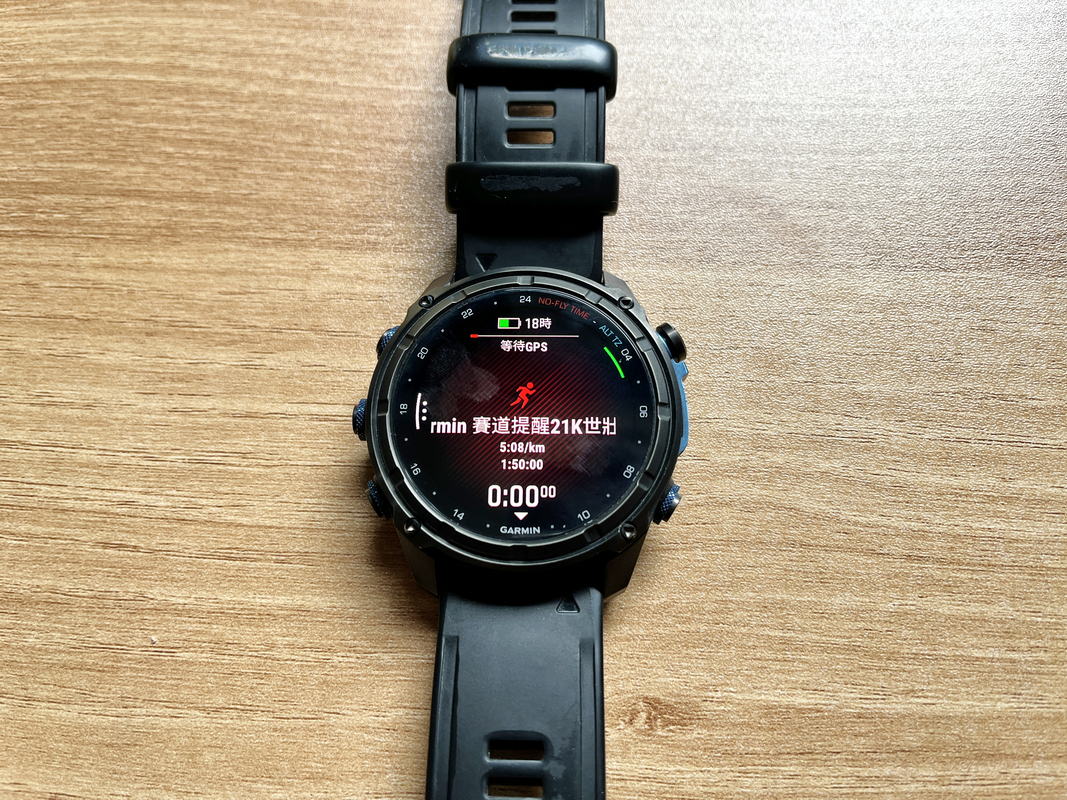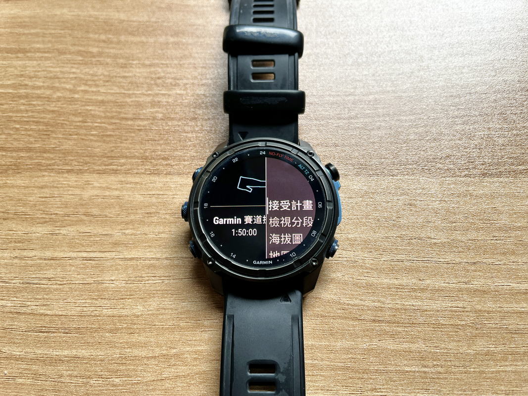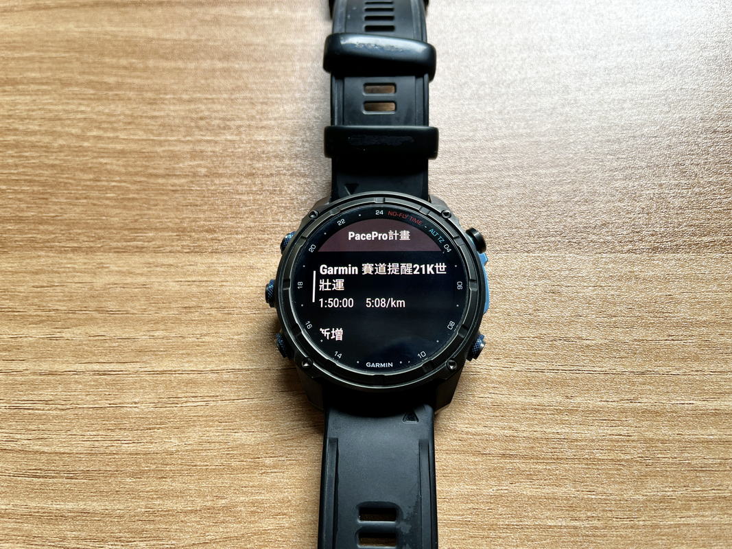 接著拿起Garmin Descent MK3i,進入跑步模式後,按下左側中間的按鈕,進入訓練模式中的“PacePro計畫”,檢視先前以手機在Garmin Connect APP所設定好的世壯運半馬配速策略是否同步至手錶當中,再按下接受計畫與啟用路線導航,確認手錶內路線、配速等資訊一切正確後,最後準備好自己的明天參賽的跑鞋、衣服、褲子、帽子、防無聊好物藍芽耳機,以及最重要的晶片與號碼布確實別好後,就準備放鬆身心,提早睡覺,迎接明天的世壯運半馬賽囉!