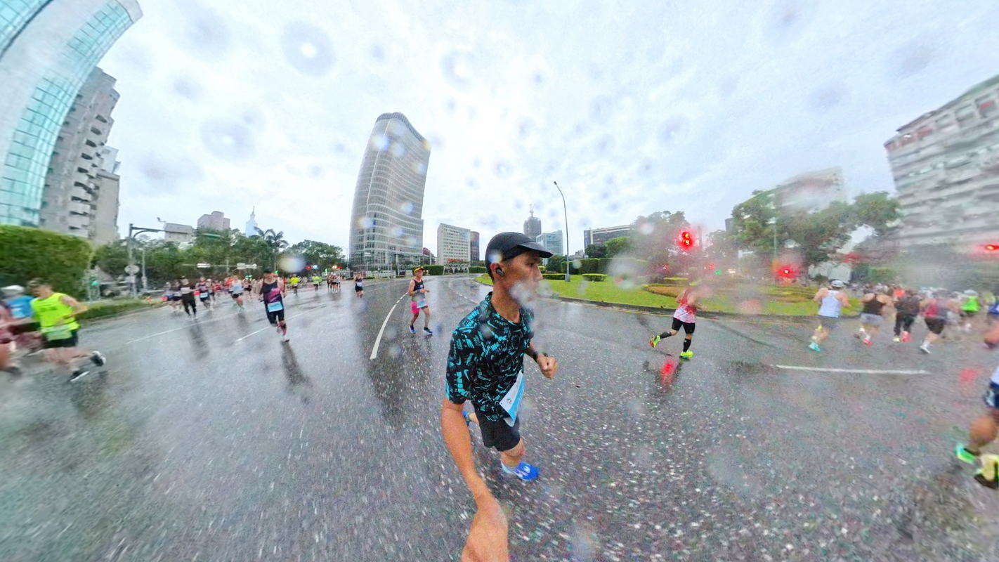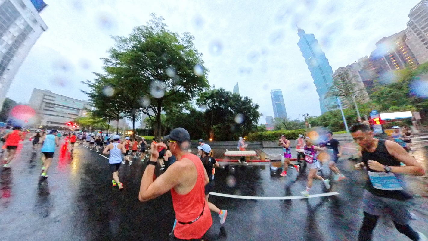 接著我們右轉進入逸仙路,再左轉進入松高路繼續前進,此時經過台北市議會時,也穿過2小時30分為完賽目標的配速員,不僅代表自己只要維持相同的節奏下,即可慢慢地脫離起跑時的擁擠人群,同時也逐漸的朝自己半馬破2的目標前進。在這場半馬賽的前段路程中,除了能跑上忠孝東路一覽台北大巨蛋之外,最令我感到印象深刻的是松高路上從昔日信義誠品大樓,而今變成準備開幕的Dream Plaza百貨,轉進松壽路時眼前佇立於眼前的高聳台北101,然後再沿著101的周圍,進入信義路,再接回市府路,回到仁愛路這一圈將近4k的路程,這樣充滿新鮮感的穿梭都會商區的路線,享受商圈中摩天大樓林立的特色,同時這天出乎意料的不是準備好感受30度左右的炙熱,而是相當涼爽的20度左右氣溫,搭配著微雨的降溫天氣,對我來說,本以放慢腳步調整心率、呼吸做為適應氣溫的熱身開機的策略,已經稍嫌多餘,提早進入最舒適的完美跑步狀態了!