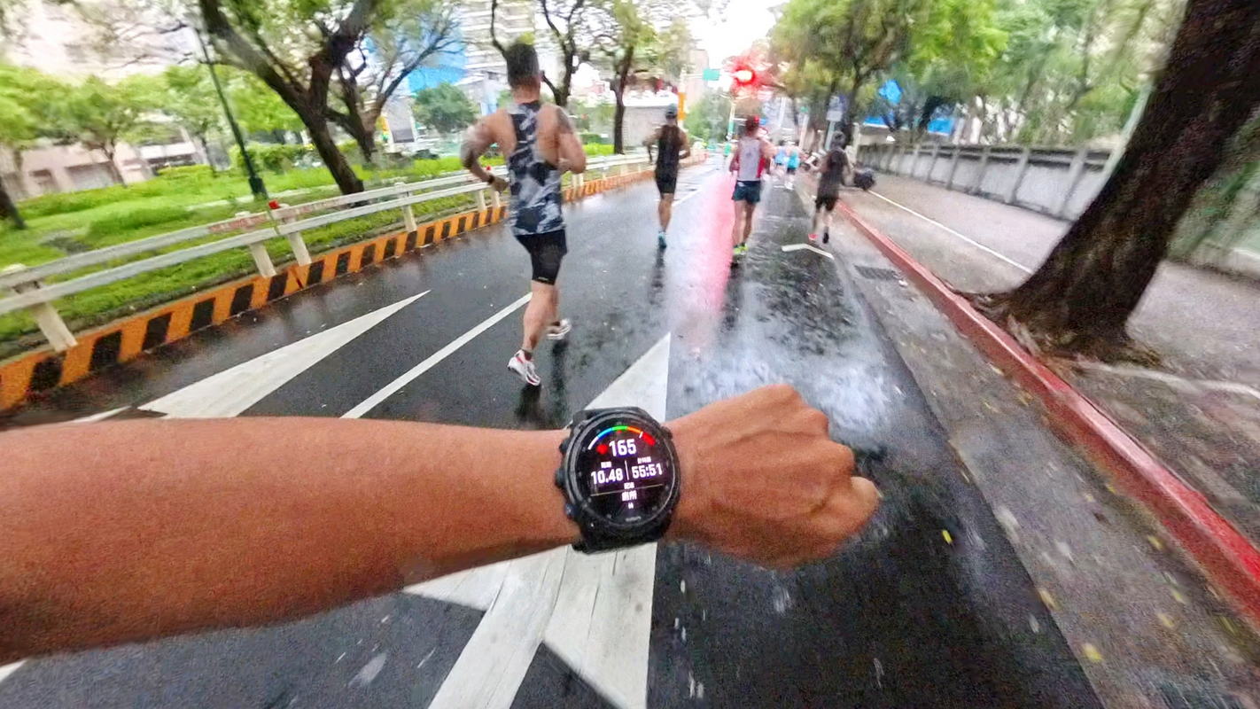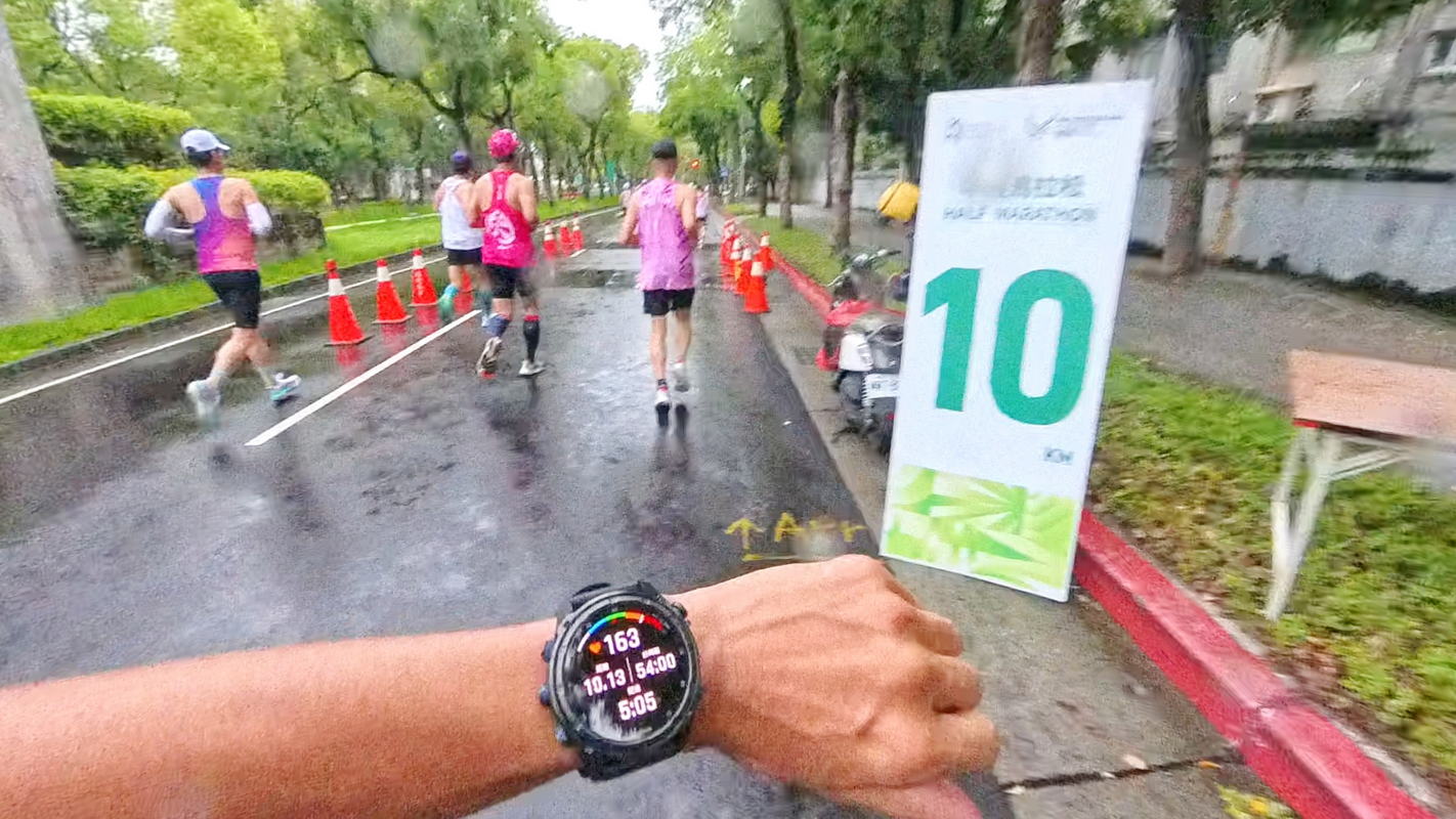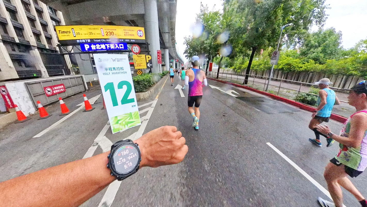 在沿著信義路繼續前行,經過一旁的國家音樂廳時,除了剛好完成8k的距離之外,同時赫然發現2小時的配速列車就在眼前,此時此刻檢視著自己的呼吸、步頻速率是否依舊維持平穩,並一步一步的超越2小時配速員,這時候心中除了相當開心已經趕上半馬破2的目標之外,也因這樣的興奮心情,讓自己的心率進入到Zone 4上限的165bpm,雖然以馬拉松配速的心率表現來看,Zone 4維持最大心率80%-90%之間是較有效率的狀況,不過距離終點還有13k的漫長距離,還是調整好自己的呼吸、步頻與步距的節奏,讓自己的心率稍微下降趨緩,並於9k時進行第一次的能量果膠補給,讓自己避免後半段發生過度疲勞而爆掉的窘境。