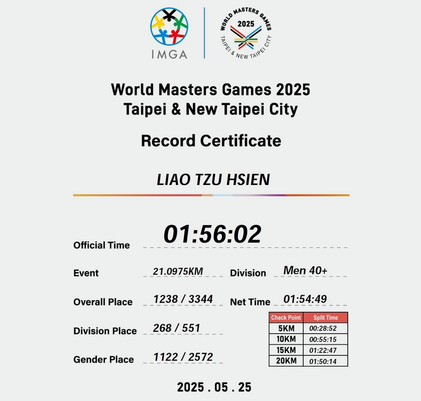 完成這次半馬路跑賽,除了相當開心的達到自己想要破2完賽的目標之外,更令我驚訝的是,或許是這3個月很認真地按“錶”操課練習,所以跑完後檢視自己的體能狀況,身體輕鬆到似乎應該可以提早在17-18k處提早全開奮力向前衝,那麼成績似乎可能在不曾想過的1小時50分左右完賽,不過這次的成績已經是讓自己相當滿意的開心,最後回到衣保區領好寄物,莎莉也順利10k完賽,與朋友們在市政府前廣場交流這次路跑賽的心得後,即便沒有過往參加路跑時的完賽禮,但能在一場身為熱愛路跑業餘人士也能參加像是專業運動員參與亞奧運世界規格的世壯運,同時能達到自己所設定的半馬破2目標,這樣難忘的旅程更是無比的珍貴呢!