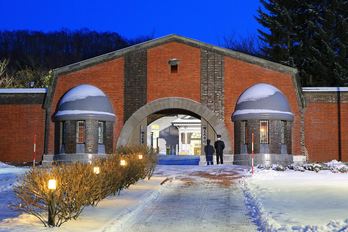 不過當我們下午4點抵達網走監獄時,由於閉館時間為下午5點,因此停止售票,只能明日早晨再來參觀,不過即便短暫撲了個空,卻在這已經進入傍晚時分所散發的幽暗夜色,以及博物館內昏黃燈光交織而成的幽禁氛圍,同時透過入口處向前方正門下站崗警衛雕像栩栩如生的凝視,這不寒而慄的氣氛我想更是在白天參觀監獄博物館所無法體會的一股沉重感呢!