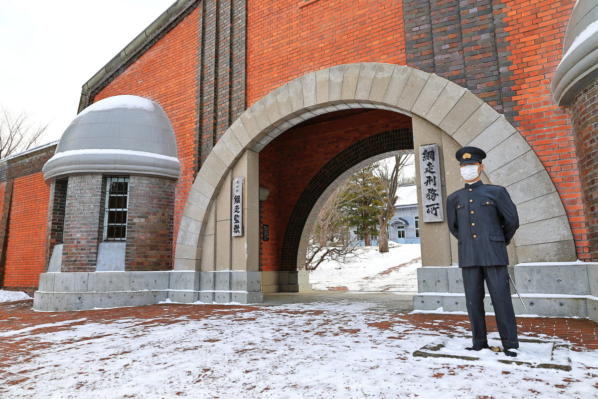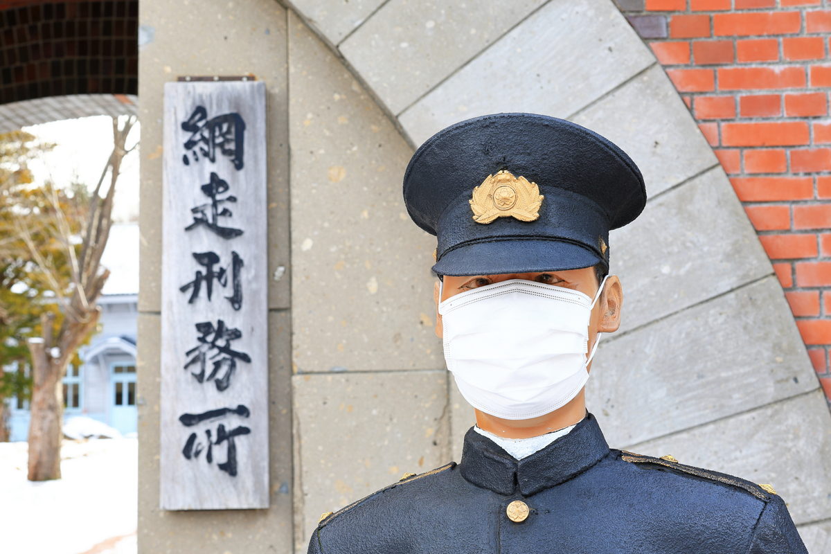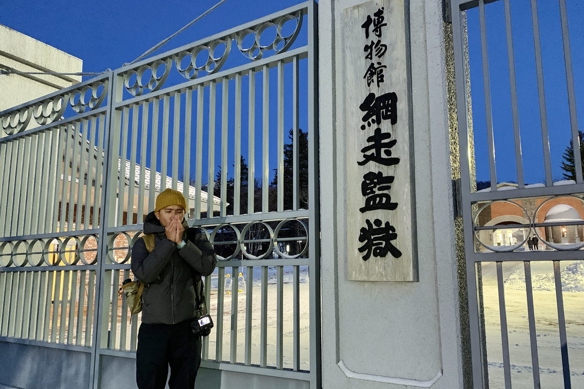 隔天早晨,我們再次前往網走監獄博物館,通過昔日進出監獄必經,同時象徵“河面為鏡、凝視我身、自整衣襟”的鏡橋,終於買了門票進入監獄博物館內參觀,此時走進正門,看著昨晚從遠方看到的站崗警衛雕像,以及身後拱門上的網走刑務所木牌,內心開始產生不安的沉重壓迫感。