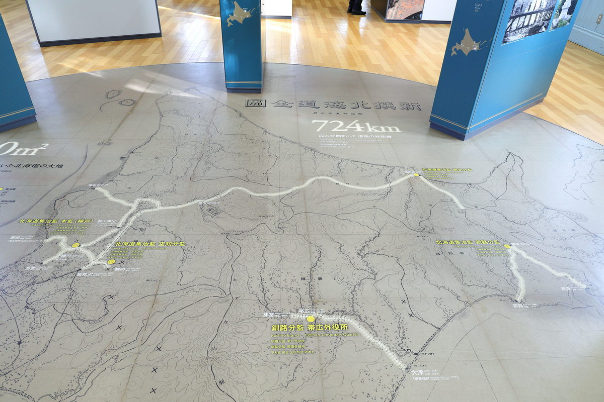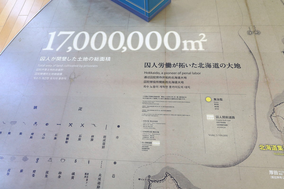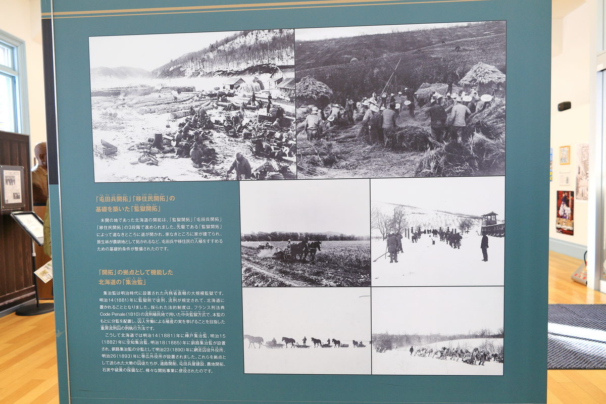 通過大門,進入眼前的大廳,映入眼簾即是明治時代政府官舍常見的仿西式建築,這一類融合巴洛克與哥德式的建築特色,迄今也能在台灣看見許多日治時代的建築縮影(如新竹火車站),在大廳內則是陳列自西元1890年,日本政府為了防範俄羅斯覬覦尚未完整開發,並蘊藏豐富礦產資源的北海道,因此移送全國各地的重刑犯,前後多達1200名犯人於北海道各地開墾,其中更僅以8個月的時間內,開闢連接北見與網走之中央道,卻也因為極少睡眠的長時間勞動、以及飢寒交迫的外役勞動環境下,造成多達211人的囚犯與警衛喪生,但也因其強迫的開墾勞動做為開端,也造就日本政府與人民開始進入北海道,專心經營開墾規劃,得以成為現在有如歐美景致氛圍的唯美國度。