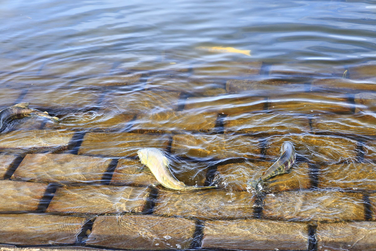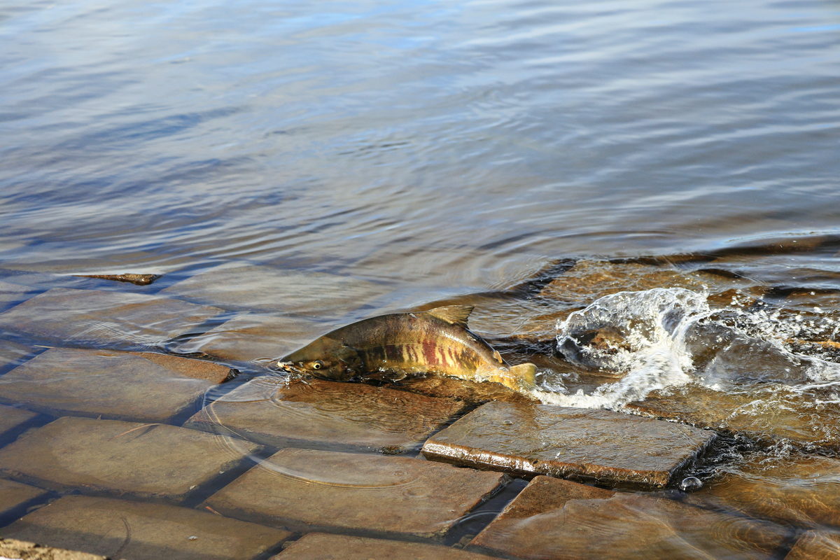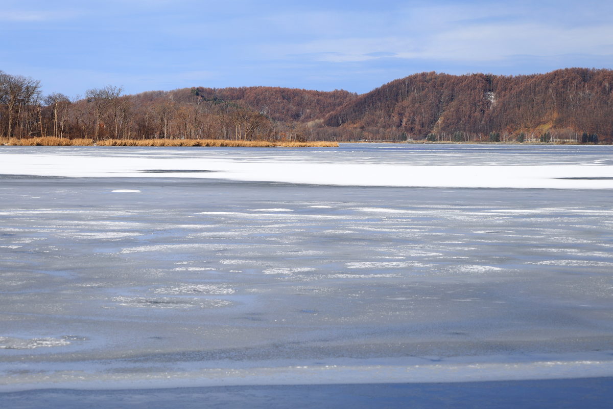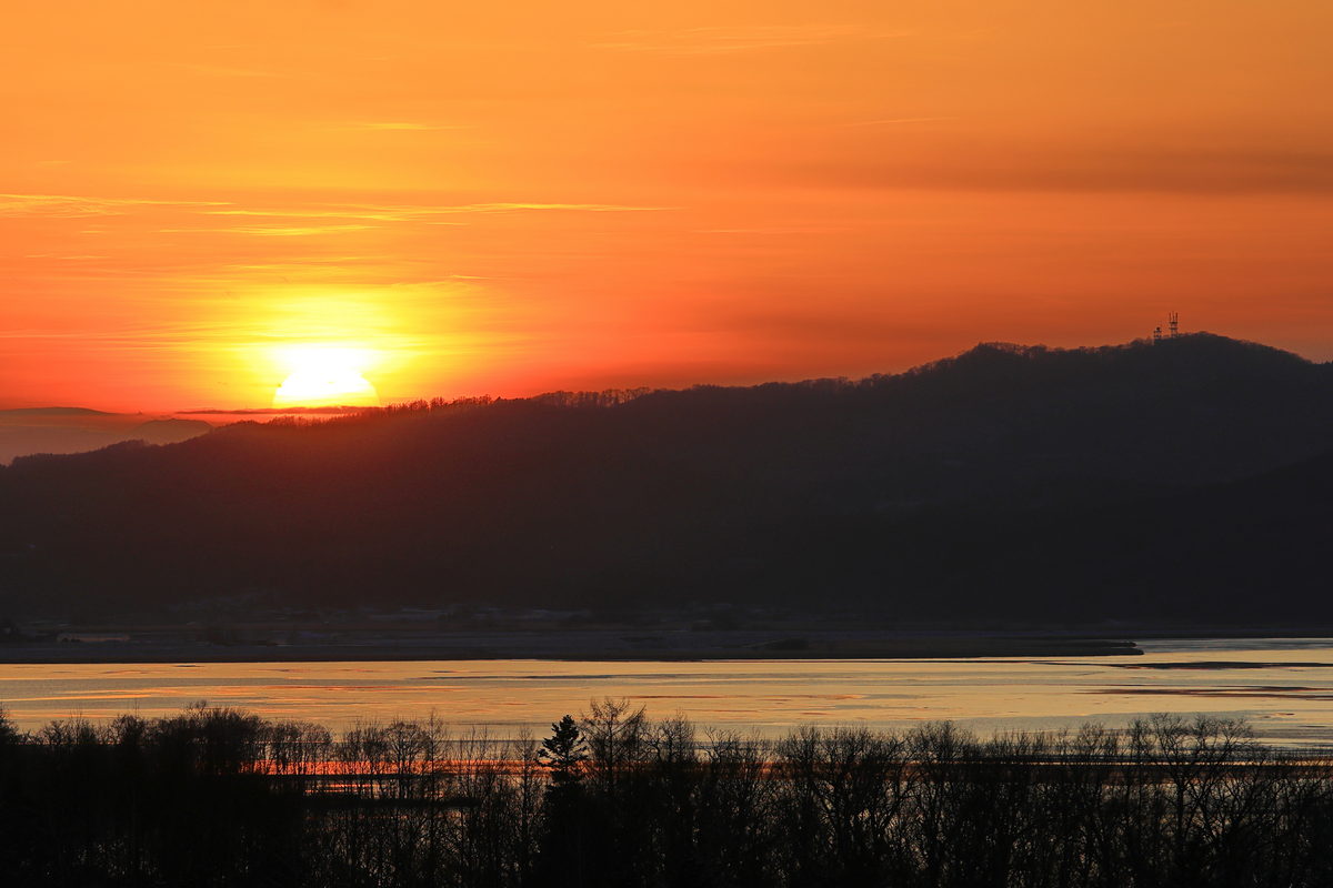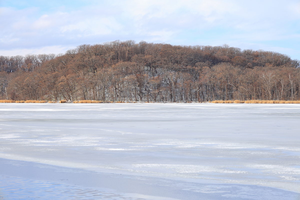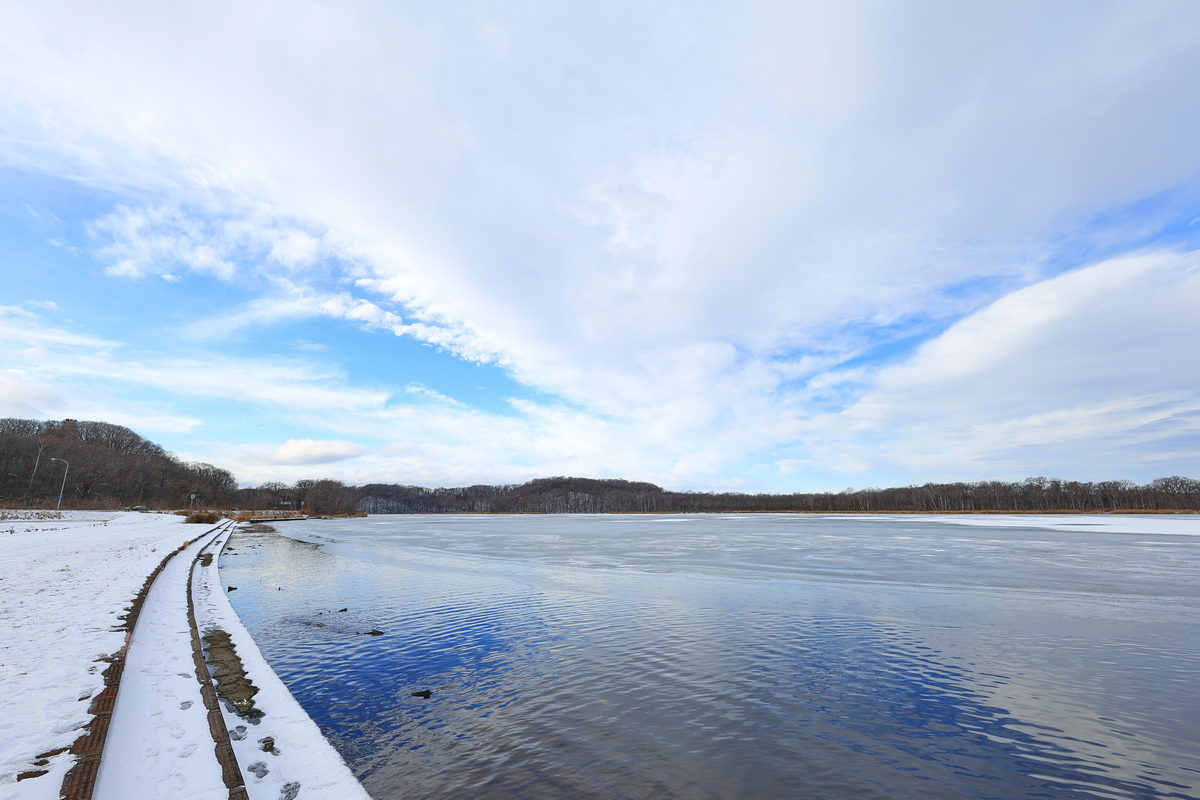 網走監獄博物館的腹地之大,若要仔細逛完,勢必得花上超過半天的時間,相當值得旅伴們前往此處細細感受,而在前一日於飯店客房內遠眺窗外夕陽西下後,暖紅餘暉照耀於【網走湖】上的獨特靜秘感,因此離開博物館後,我們前往位於一旁的網走湖欣賞這片秀麗的湖岸景致,同時轉換參觀監獄博物館的沉重心情,抵達舖滿白雪的網走湖停車場,踩著鬆軟的積雪前往湖畔,此時湖面中央已漸漸結冰,並附上薄薄的白雪,其對應著遠處的散發暖紅色調的樹林山丘,更是一種獨特的雅致,而且有趣的是,或許是水溫較暖,在尚未結冰的湖岸,聚集著相當肥碩的鮭魚/鱒魚群在岸邊棲息,一開始還以為牠們是擱淺了呢。