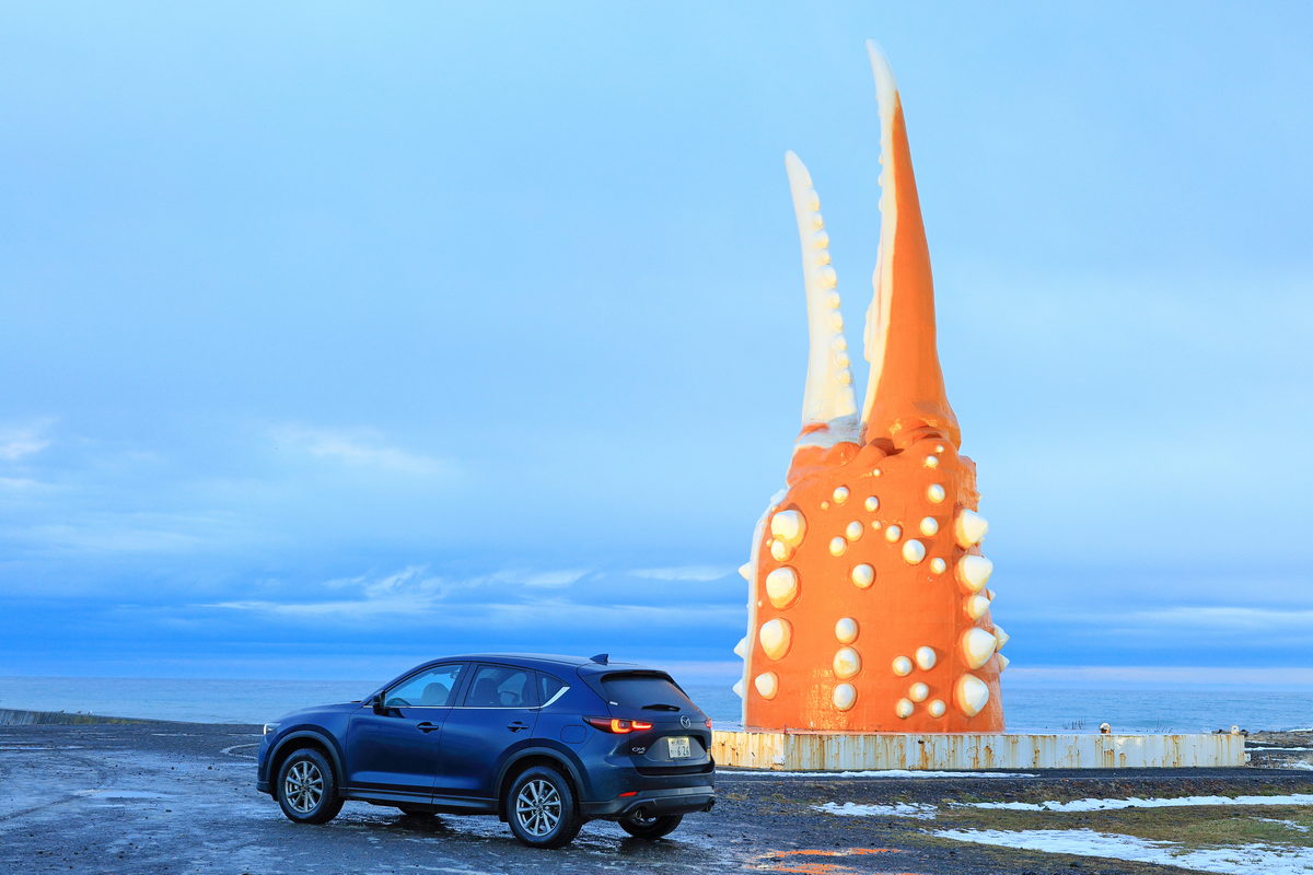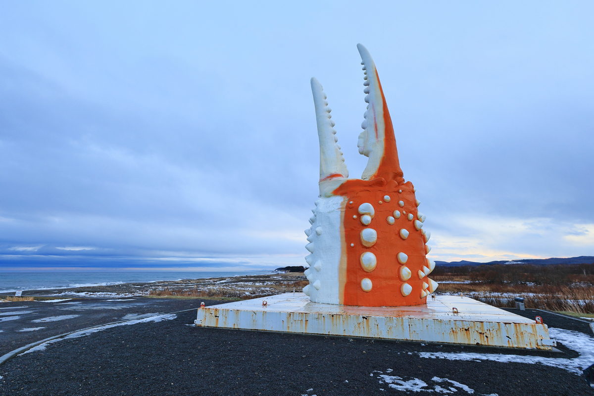 因此在這段路上,也無法閒情逸致的欣賞沿途北海岸飛雪景致,因為路程才開了1/3,抵達象徵北海道為螃蟹最大產地,同時盛產「毛蟹、帝王蟹、松葉蟹」紋別港的巨大【蟹爪】地標,已經因為天色漸暗點亮燈火,此時看著佇立於港岸旁高12公尺的大蟹爪,對比天色昏暗且寒風吹彿的海岸,好似電影神鬼奇航地2集的深海閻王(Davy Jones)即將登場的神秘緊張感呢!