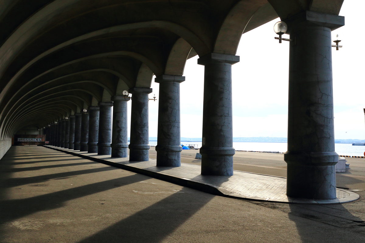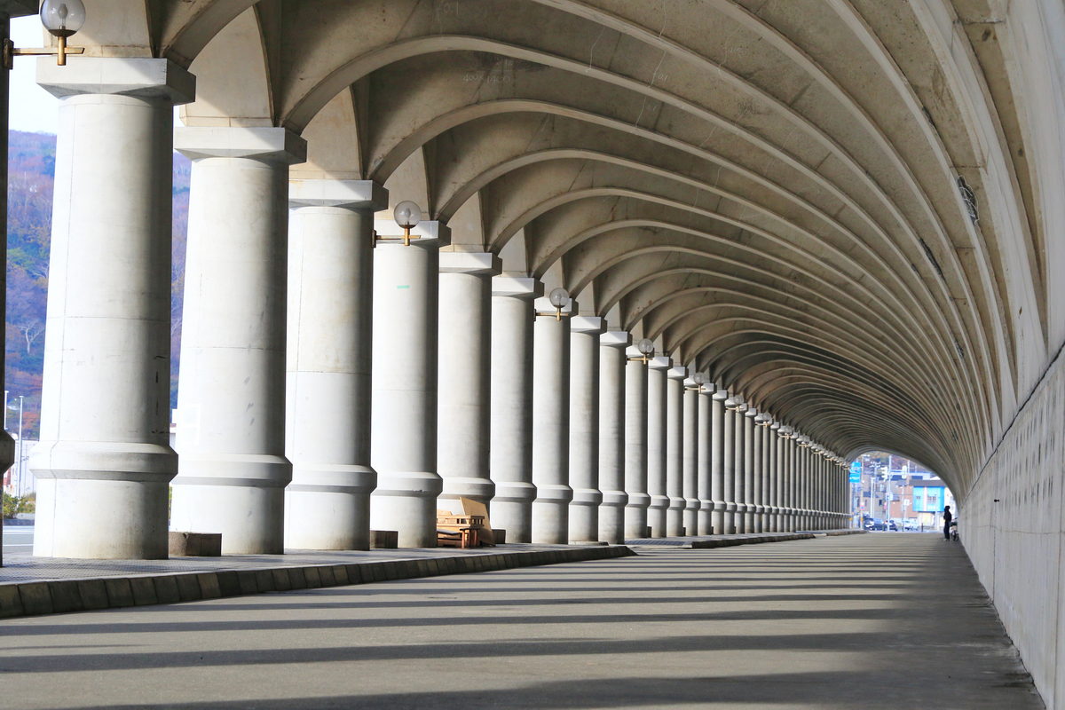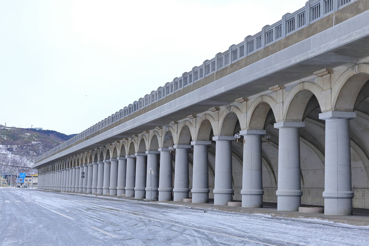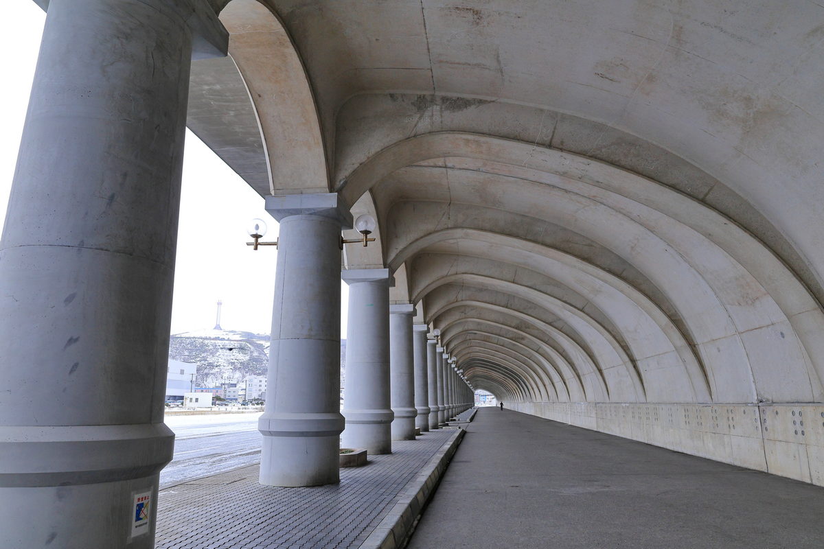 旅行景點是防波堤?是的!你真的沒有看錯,稚內位於日本海與鄂霍次克海之間所形成的宗谷海峽地形,因此當地近海波濤洶湧,海況相當惡劣,因此為了保護港口得以運作,於西元1910-1919年,興建一座高5.5公尺的北防波堤,藉此保護港口,以利當時庫頁島南端還是日本領土的稚泊航路運行,而後由於防波堤高度不足以抵禦海浪襲擊,因此西元1931年依照建築師土谷実的設計,挑高至13.6公尺,同時以70根圓柱撐起穹頂,並於西元1936年竣工,造就整體有如歐洲巨型拱門的稚内港北防波堤,漫步在這總長427公尺的防波堤下方,透過這獨特的透視延伸感,此時此刻如同古羅馬時代的迴廊,不說這是一座位於日本的防波堤,還真的難以想像呢!