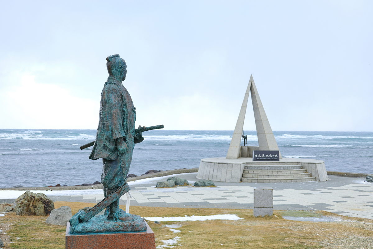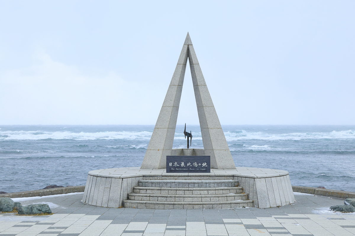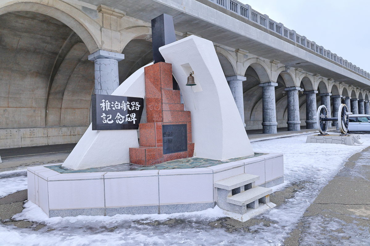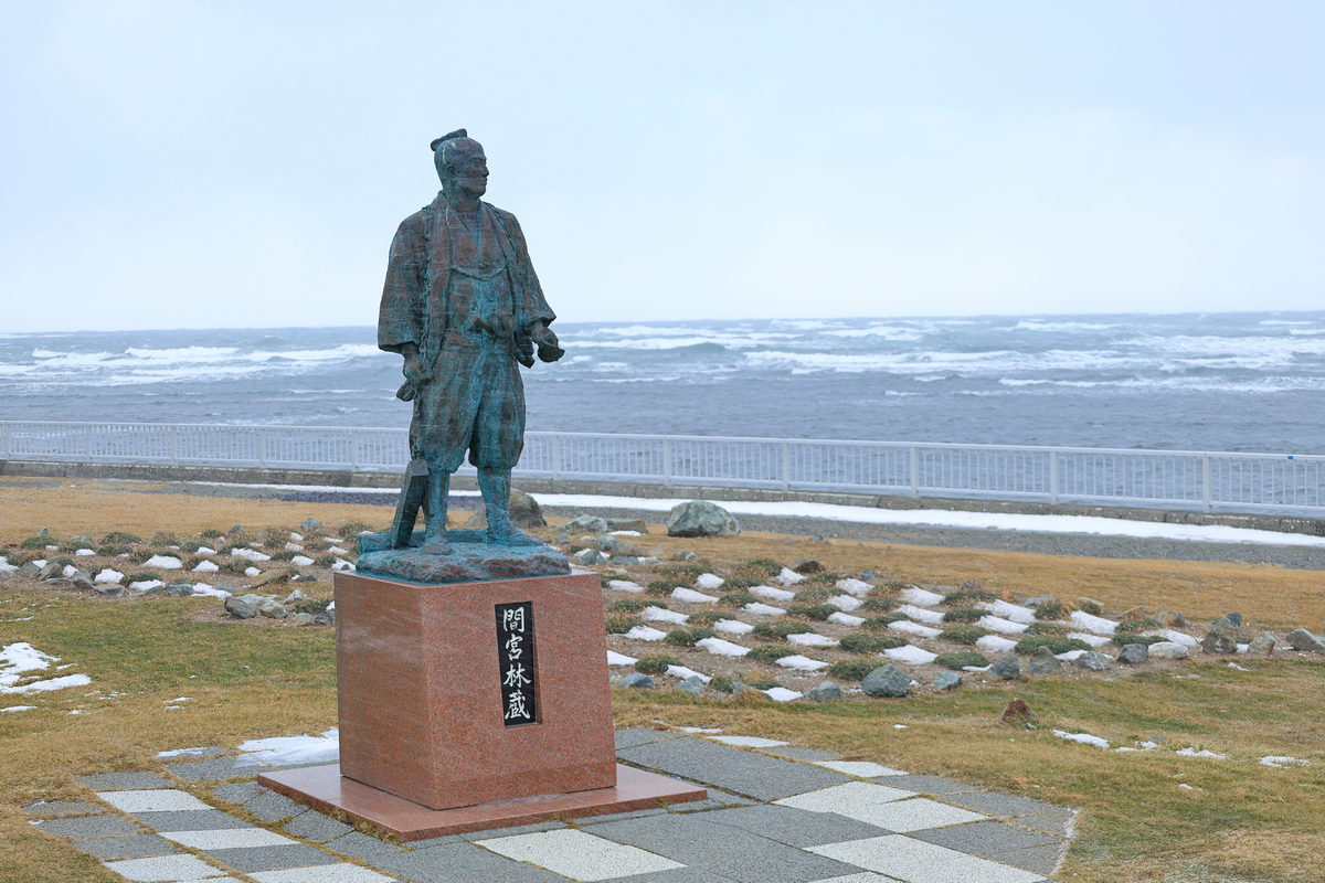 上一次造訪稚內防波堤時,是還在汽車媒體的我於秋季時前往北海道的自駕旅行,當時對於這座極具氣勢的防波堤念念不忘,此行在冬季的飛雪之下,搭配著一旁附上冰雪結冰的稚泊航路紀念碑、以及相當寒冷孤寂的港口一隅,更是有種不畏酷寒艱辛於此奮力求生的強烈意志力呢,而這樣的意志力,其實早在江戶時代,由幕府任命的探險家“間宮林藏”前往當時還稱作蝦夷的北海道進行探索,而在西元1809年時於稚內最北端的【宗谷岬】發現北方海域的庫頁島,並渡海探索庫頁島,將當時世界地圖的完整樣貌再勾勒上一塊拼圖,在稚內旅行最後一個景點宗谷岬上,在這惡劣的冬季天候,雖然無法像身旁間宮林藏雕像一樣,能遠眺42公里外的庫頁島,感受其探險帶給人們的嚮往魅力。但我想,稚內雖然不是北海道熱門的觀光地點,但這座最北小城帶給人們面對自然的冒險犯難精神,卻是這座城市最值得細細品味的地方呢!